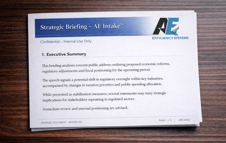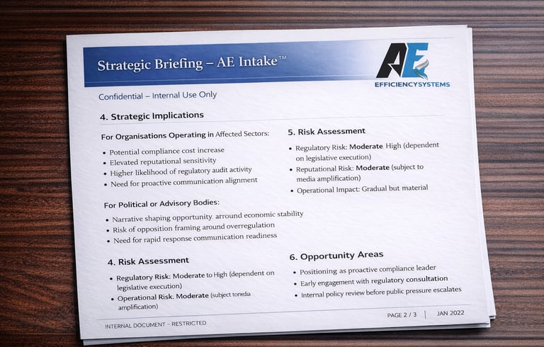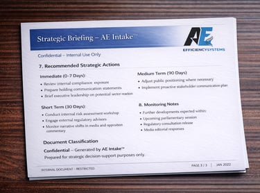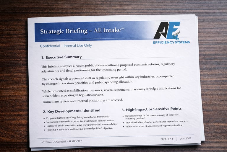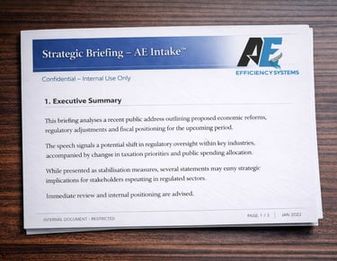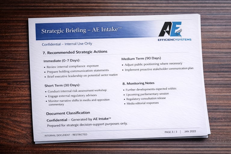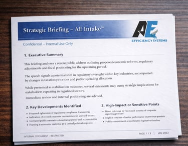AE Intake transforms external content into structured executive briefings with key risks, implications and recommended actions.